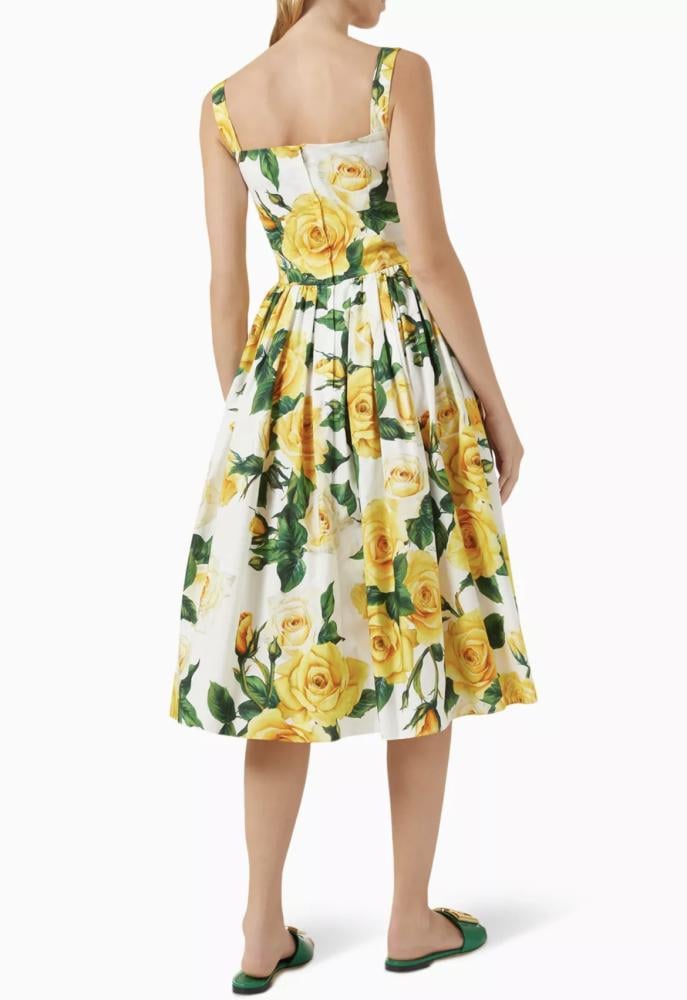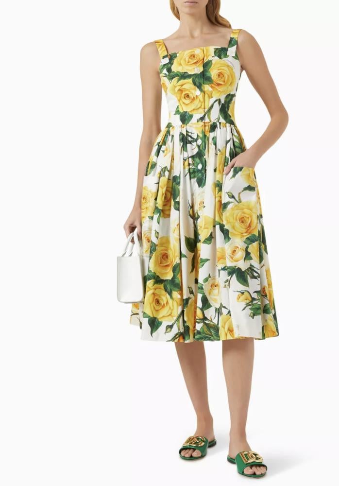 فستان متوسط الطول بنقشة زهور قطن بوبلين